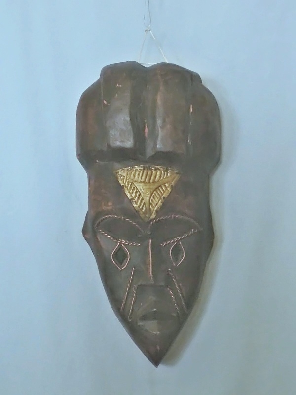 Die Hochzeitsmaske (H ± 39 B ± 19 cm) aus Holz mit Kupfer beschlagen ist Handarbeit aus Kamerun.